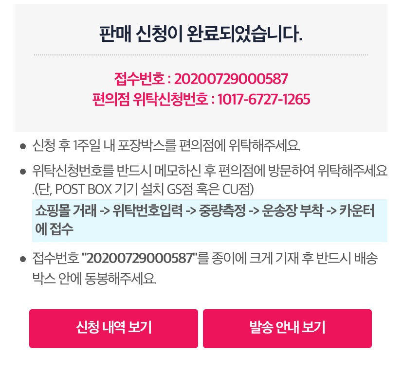 밑에 판매신청 완료되었다는 페이지로 넘어갑니다.